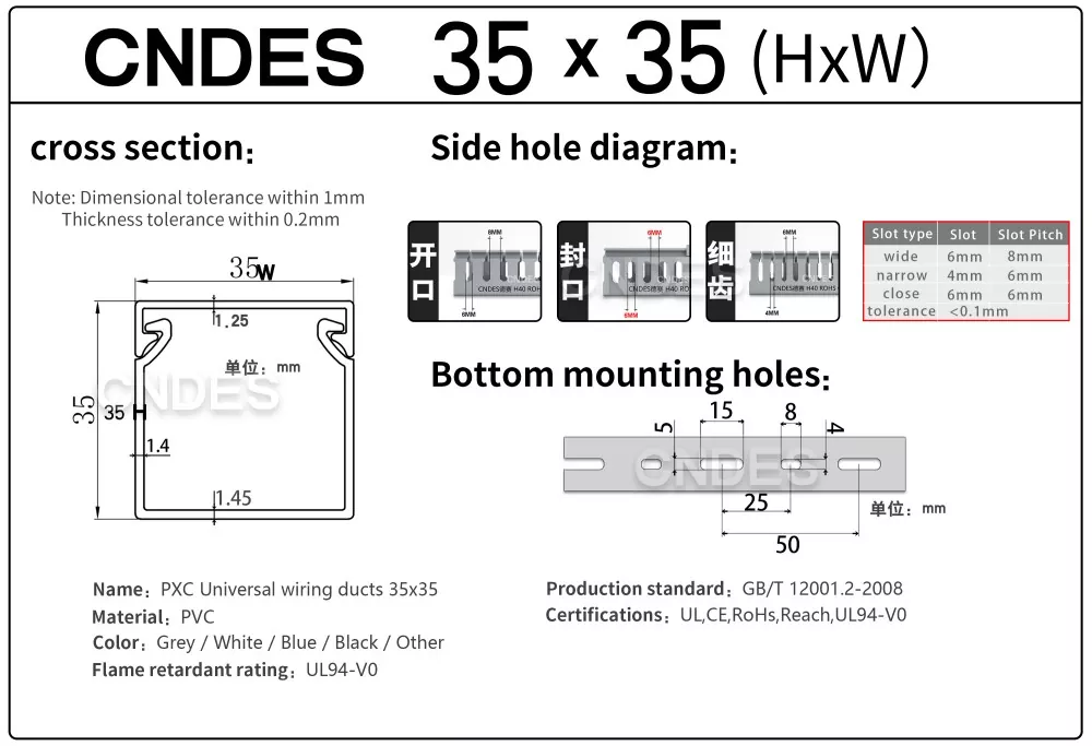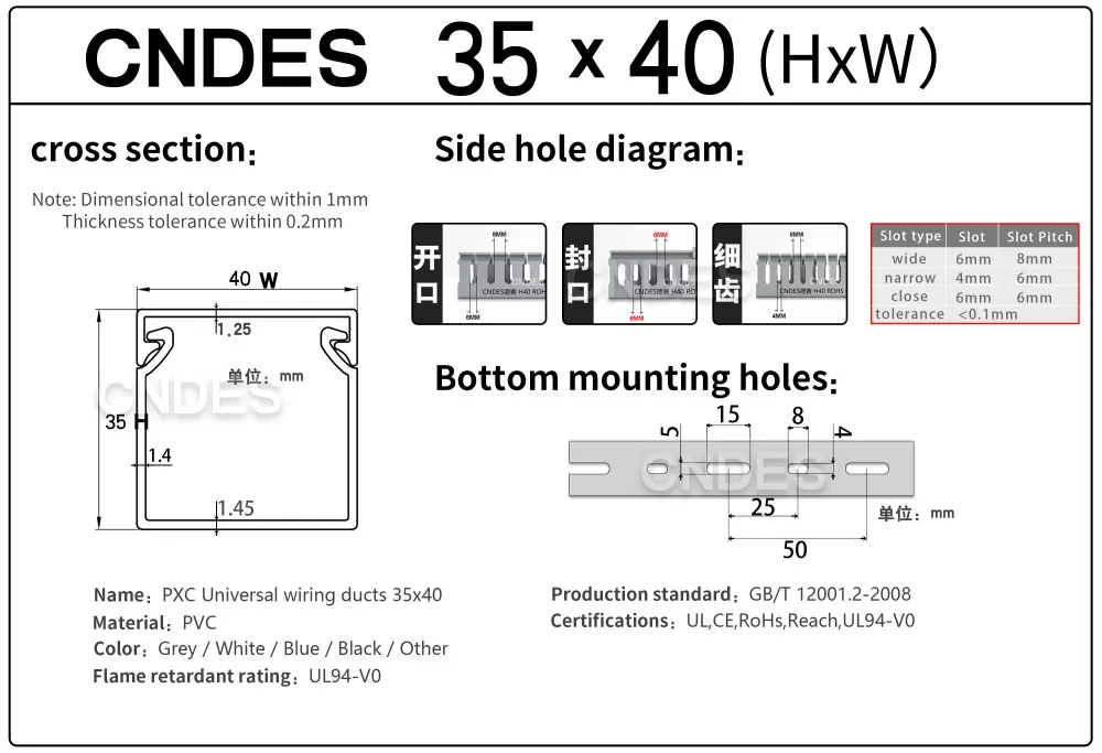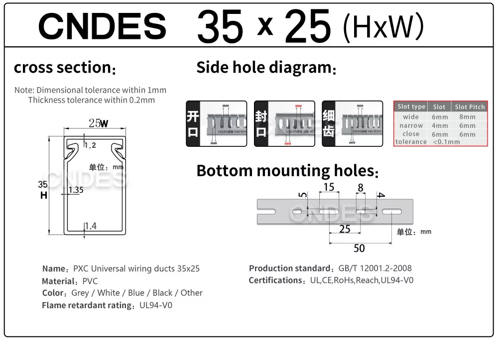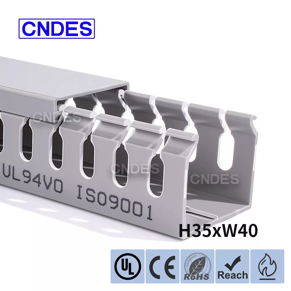 Çin şirketi CNDES tarafından üretilen Özelleştirilmiş 35mm Yükseklik Oluklu PVC Tel Yönlendirme Kanalı, sert bir PVC taban ve çıkarılabilir bir kapaktan oluşur. Tabanda her iki tarafa da damgalanmış, "tarak dişleri" oluşturan eşit mesafeli parmak benzeri oyuklar bulunur. Bu dişler elle kırılarak telin herhangi bir pozisyondan yatay olarak çıkmasına olanak sağlanır. Kapak kolayca yerine oturarak düzgün bir görünüm sağlar. Alttaki bir sıra montaj deliği DIN 43659 standart aralığına uygundur. M5 vidalar veya perçinler kullanılarak panellere, dolap çerçevelerine veya benzer yapılara hızlı bir şekilde sabitlenebilir.