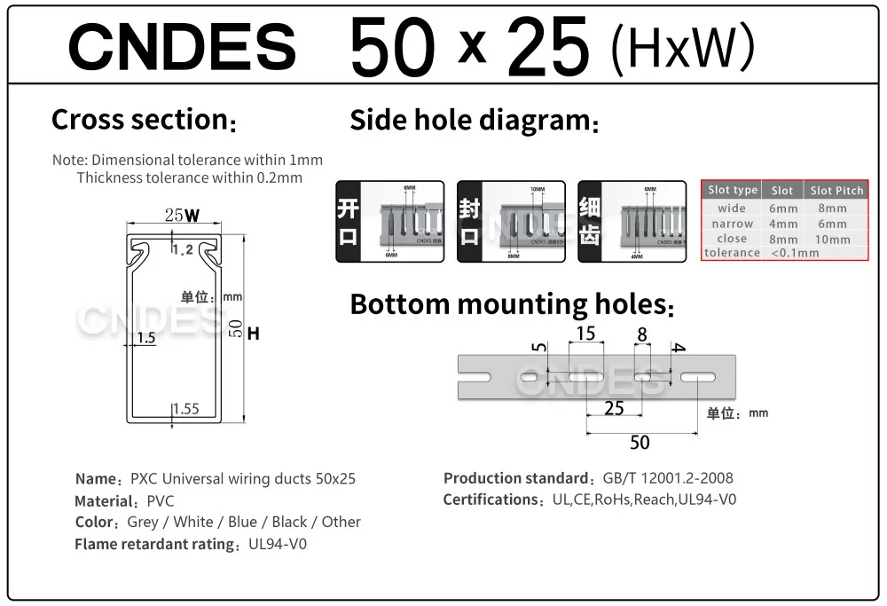 Yüksek kaliteli PVC hammaddelerinden üretilmiş, çevre dostu, alev geciktirici ve yüksek mukavemetli fiziksel özelliklere sahiptir. CNDES Oluklu PVC Elektrik Kabini Kanalını fabrikamızdan satın alacağınızdan emin olabilirsiniz.
